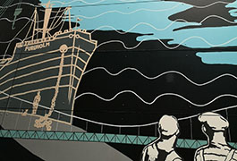 Tidigare en trist svart plåtfasad. Nu en vacker spegling av närområdet och återblick av livet vid hamnen. Målningen är en del av projektet ”Sätt färg på Göteborg” som sysselsätter arbetssökande ungdomar, som ICA Fastigheter sponsrar.